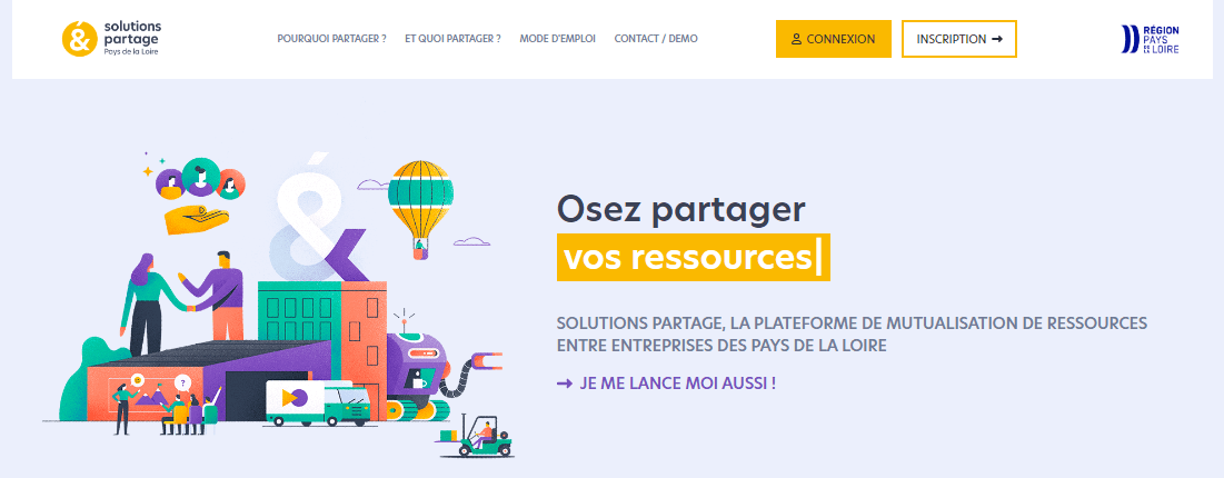 Le prêt et la mutualisation de ressources sont des moyens économiquement très avantageux pour toutes les entreprises d’un même territoire. Solutions partage met en relation les entreprises des Pays de la Loire qui partagent des ambitions communes pour faire de cette pratique une nouvelle forme de gestion et de performance économique. Ce service est développé par Solutions&co, offert par la Région des Pays de la Loire, proposé et animé par les intercommunalités.