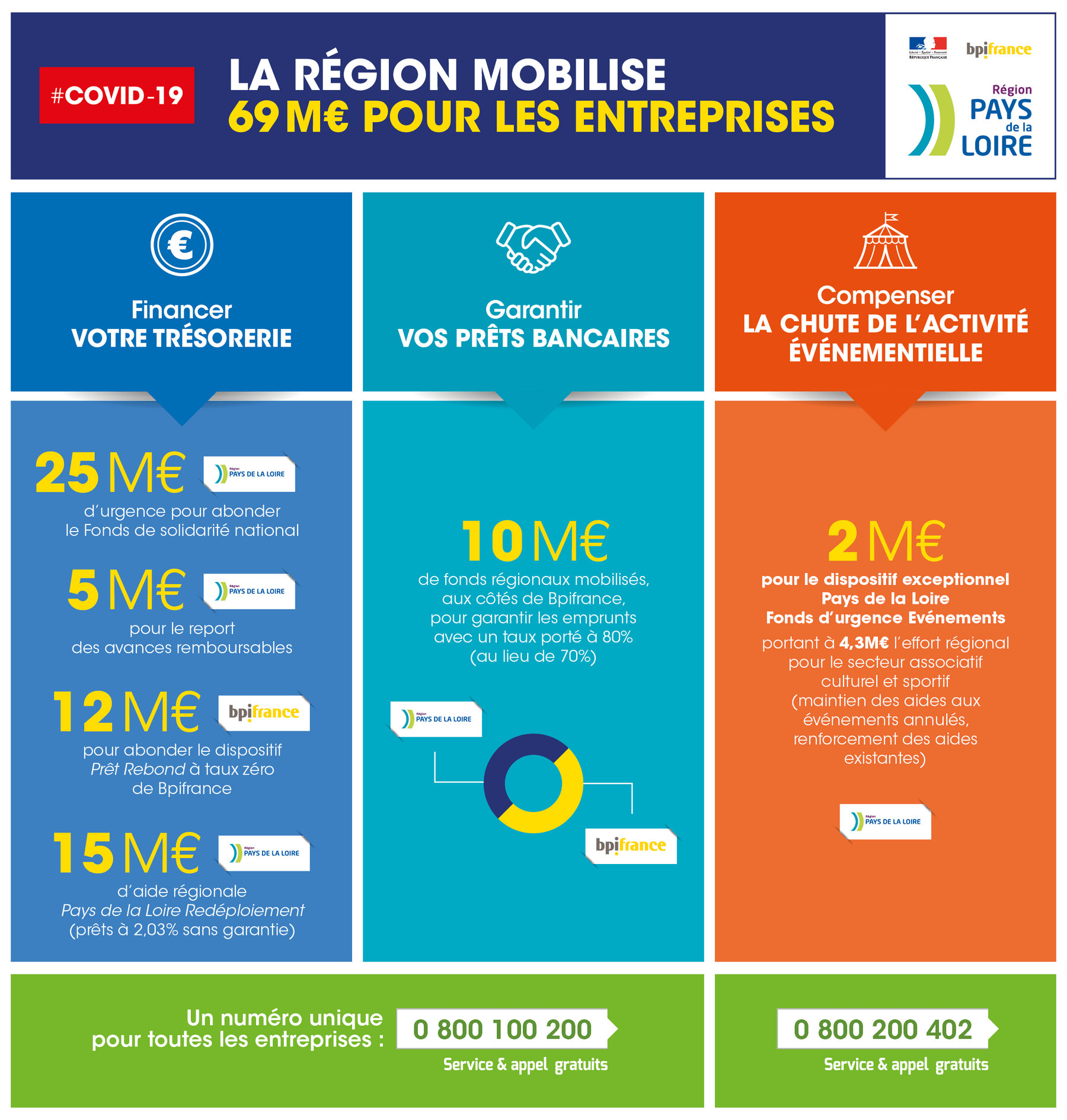 Pour ne laisser aucune entreprise seule face à ses difficultés et à la violence de la crise économique engendrée par la pandémie de Covid-19, la Région a mobilisé dès le début du confinement 69 M€ pour déployer un plan d’urgence lancé en lien avec l’Etat et BPI France pour répondre aux besoins de tous les acteurs économiques : artisans, commerçants, agriculteurs, TPE, PME, ETI, grands groupes et associations du monde culturel et sportif.