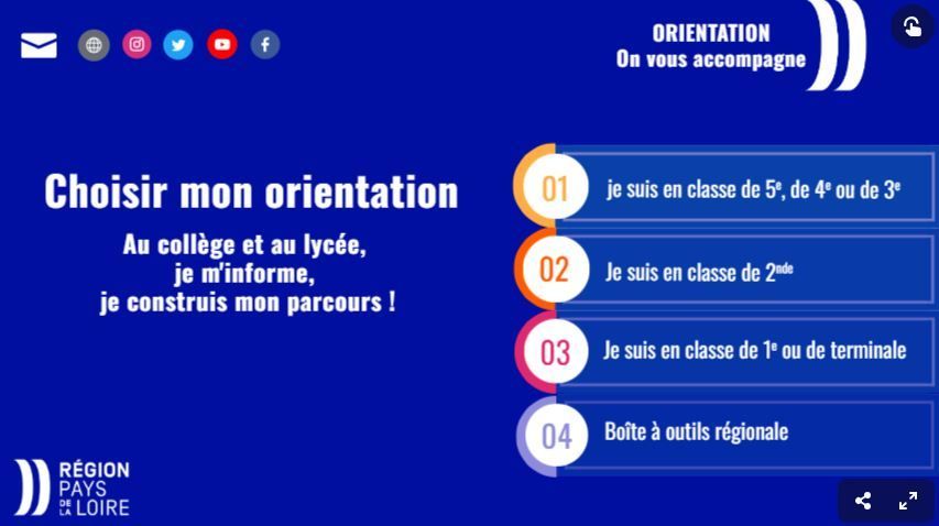 • Un site dédié à l’Orientation choisirmonmetier-paysdelaloire.fr : ce portail offre des services numériques innovants pour : rechercher des métiers et des formations à partir des centres d’intérêt et des compétences, visualiser pour chaque fiche métier le potentiel d’embauche, la localisation des entreprises qui recrutent, les débouchés, etc., entrer en relation avec un conseiller, des étudiants, apprentis, entreprises, qui témoignent de leurs parcours et de leurs métiers.