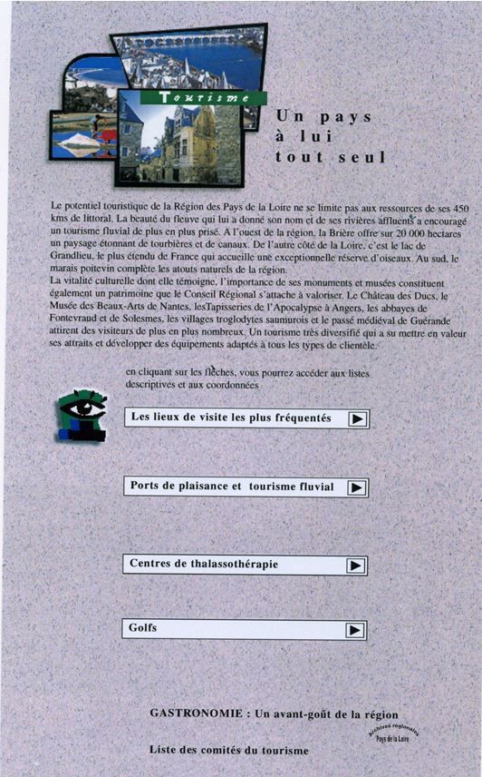 L’url du site de 1996 est un peu différente dee l’actuelle, mais caractéristique des noms de sites utilisés à l’époque par les collectivités : www.cr-pays-de-la-loire.fr. Cette première génération du site web propose un accès – à partir de la page d’accueil – à des pages d’informations à caractère général : actualités, géographie-infrastructures, économie, tourisme, événements-festivals, gastronomie. L’institution, incarnée par le Président Olivier Guichard (dont la photographie apparaît), est présentée à travers ses principales missions.