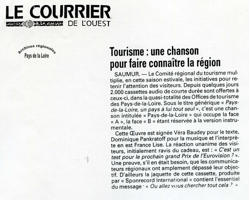 Vous connaissez peut-être déjà sa mélodie car sa version instrumentale a longtemps servi de musique d’attente au standard de la Région. La version chantée, par France Lise, interprète nantaise, figure également sur le support sonore conservé aux Archives régionales. Les cassettes étaient distribuées pendant l’été 1996 dans les offices de tourisme des Pays de la Loire.