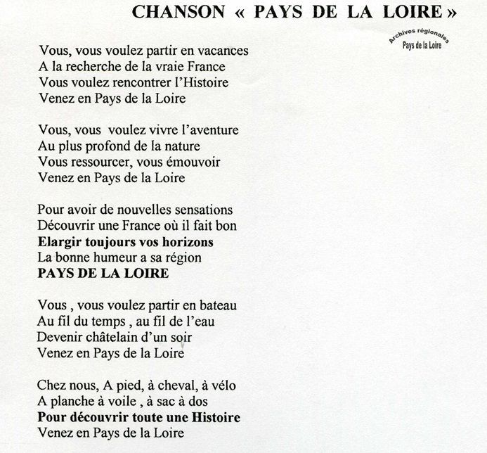 Le saviez-vous ? Les Pays de la Loire ont leur chanson. Intitulée « Pays de la Loire, un pays à lui tout seul », elle a été créée en 1996 à l’initiative de la Région, qui a fait appel à Véra Baudey pour les paroles et au compositeur Dominique Pankratoff - auteurs ensemble ou séparément de nombreuses chansons pour des dessins animés (Speedy Gonzalès) et des interprètes de chanson française (Demis Roussos, Jairo, Sabine Paturel, etc.).