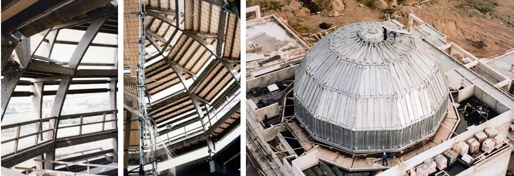 Si les structures apparentes en béton armé signifient immédiatement la modernité des années 1980, l’usage du bois peut surprendre. C’est ce même matériau que retiennent les architectes pour l’immense coupole portée par douze corbeaux en béton armé au-dessus de la salle d’assemblée. Reprenant l’idée du cintre en bois utilisé par les bâtisseurs de cathédrale pour modeler les voûtes, ils projettent à l’intérieur d’un carré de la taille du grand hall, une coupole dodécagonale formée d’une double charpente en bois lamellé-collé. Des feuilles de zinc enveloppent le dôme sur lesquelles vont être fixés des panneaux de verre, des miroirs destinés à diffuser la lumière.