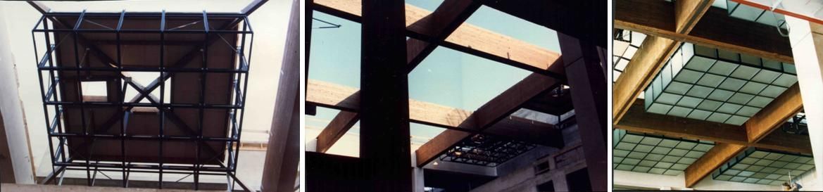 Le plafond à caissons du grand hall, une autre référence à l’architecture classique, est soumis à la même grille de carrés réguliers assemblés. Les solives en bois lamellé-collé forment neuf compartiments, chacun est occupé au centre par un caisson de verre suspendu isolé du cadre par une bande de lumière naturelle. Une épaisse peinture grise masque aujourd’hui la structure bois.