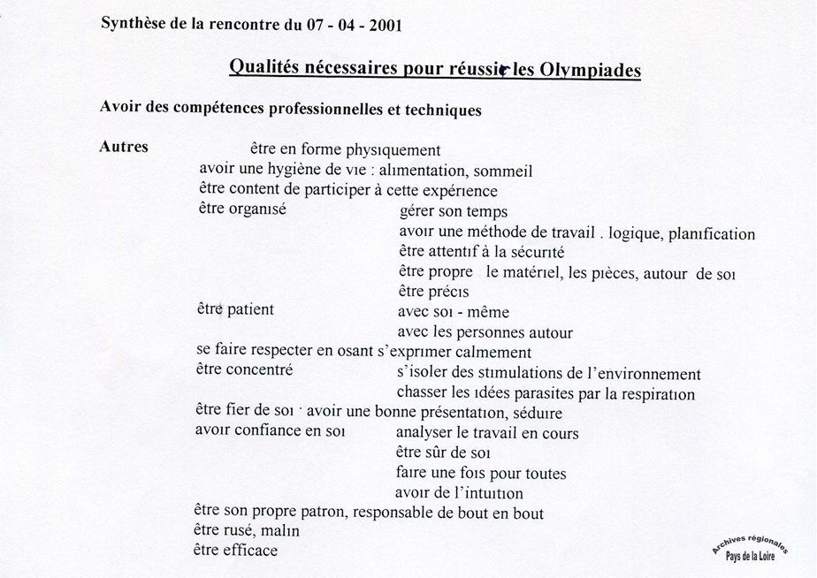 - 358PR 62 : 37e Olympiades, participation de la Région : brochure de présentation (avec liste des métiers), synthèse de la préparation à la gestion du stress des sélectionnés (2002), factures de la matière utilisée pour les épreuves de couture et de boulangerie (2000) (Archives Direction Formation professionnelle et apprentissage) ;
