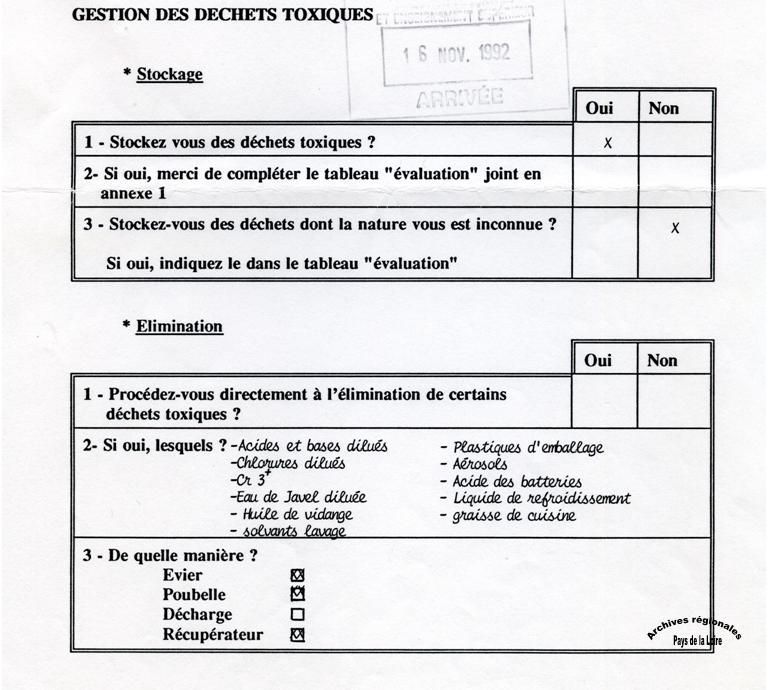 Une première enquête est menée dans les établissements secondaire et supérieur afin d’évaluer les usages et surtout les besoins en matière d’élimination des déchets toxiques. Un exemple de grille d’enquête nous donne un aperçu des types de déchets présents dans un lycée professionnel de Loire-Atlantique.