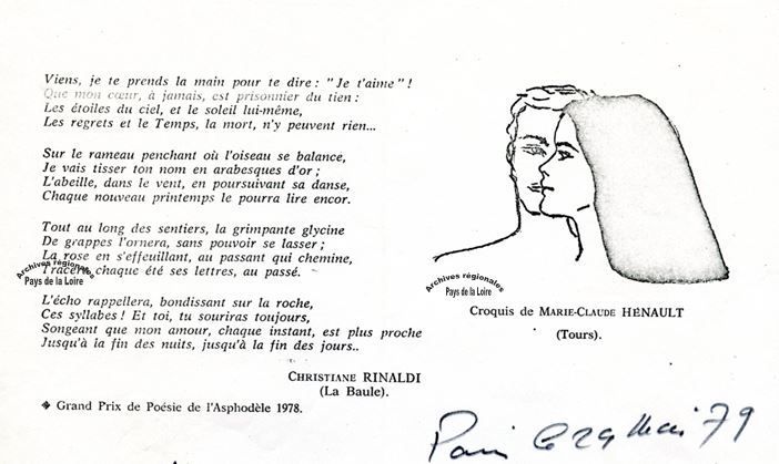 Un poème envoyé par la poétesse Christiane Rinaldi (1907- ?) en 1979 à la Région, dans le cadre d’une enquête sur les hommes et femmes célèbres et méconnus des Pays de la Loire (nés ou vivant sur le territoire régional) :