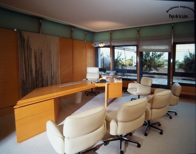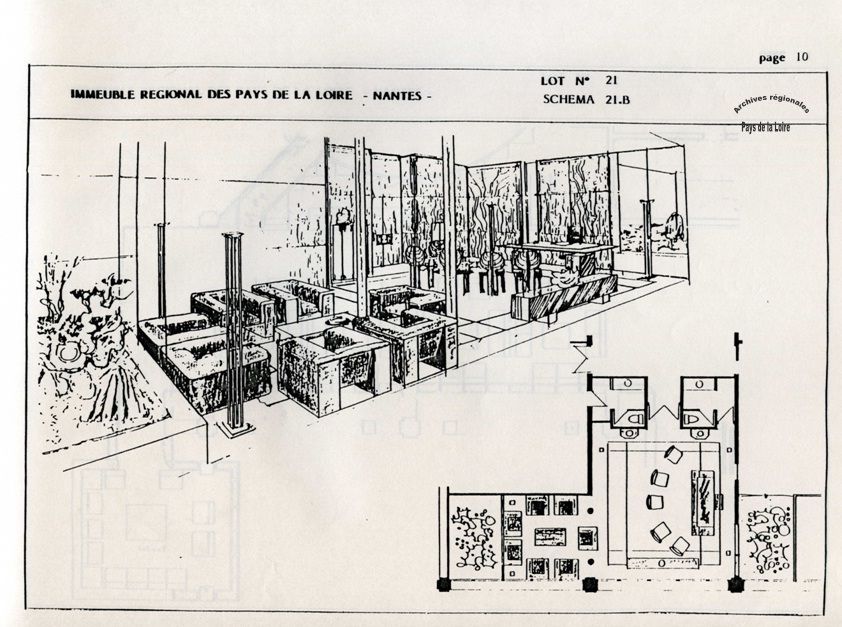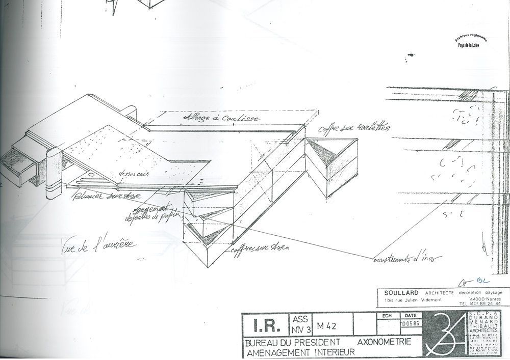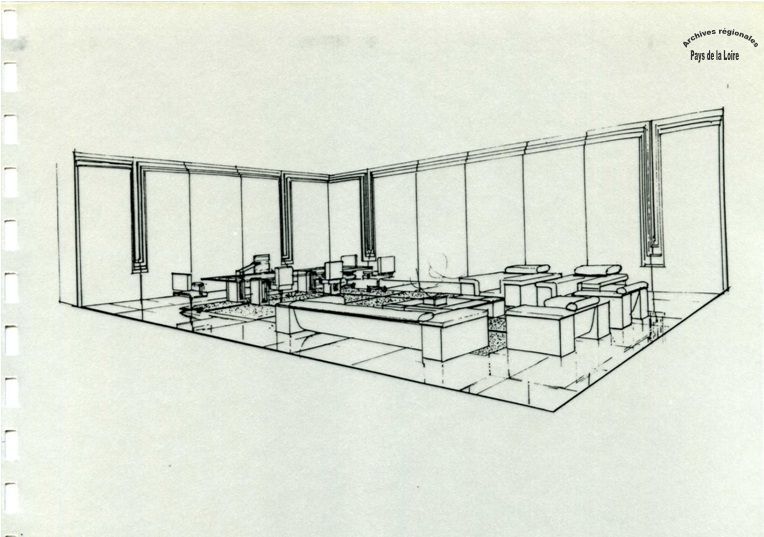 Qu’attend-on du bureau d’un Président du Conseil régional ? Lors de la conception du premier Hôtel de Région construit en France - celui des Pays de la Loire, à l’initiative d’Olivier Guichard - les deux fonctions de cet espace ont été affirmées : lieu d’accueil des personnalités de marque amenées à rencontrer le Président, et bien sûr lieu de travail de ce dernier. Voici la façon dont les architectes retenus ont présenté leur projet d’aménagement de ce bureau en 1983 (l’un des premiers croquis réalisés pour sa conception) :