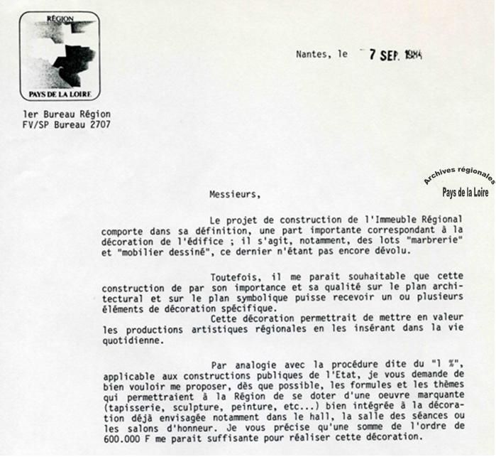 Dès septembre 1984, un courrier est transmis à ce sujet aux architectes maîtres d’œuvre Durand-Ménard-Thibault, indiquant qu’il paraît « souhaitable que cette construction de par son importance et sa qualité sur le plan architectural et sur le plan symbolique puisse recevoir un ou plusieurs éléments de décoration spécifique. Cette décoration permettrait de mettre en valeur les productions artistiques régionales en les insérant dans la vie quotidienne ». La Région demande aux architectes, « par analogie avec la procédure dite du 1% » de lui proposer « les formules et les thèmes qui permettraient à la Région de se doter d’une œuvre marquante (tapisserie, sculpture, peinture, etc.) bien intégrée à la décoration déjà envisagée ».