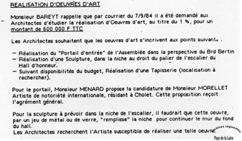 Une somme de 600.000 F TTC est réservée en juillet de la même année pour l’acquisition d’une œuvre d’art à installer dans ce qui est encore appelé à l’époque « l’Immeuble régional ». Le choix des types d’œuvres et des artistes se dessine dans les mois qui suivent, comme en témoigne ce compte rendu d’octobre 1985.