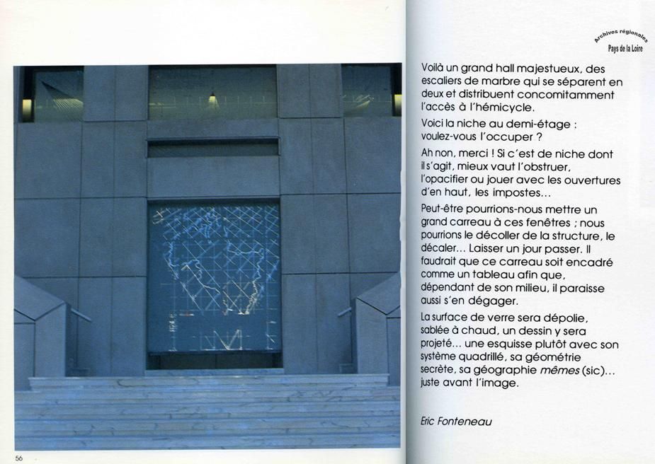 La conception de cette sculpture (dont il est souhaité qu’elle soit basée sur des jeux de lumière) est confiée à l’artiste nantais Eric Fonteneau en 1986, et consiste en 5 « vitrages feuilletés » de différentes dimensions, et « d’un sablage des motifs », suivant le croquis ci-contre présenté par l’artiste.