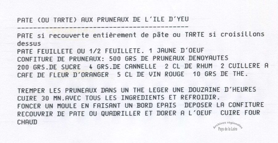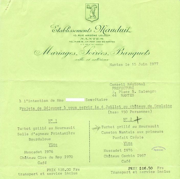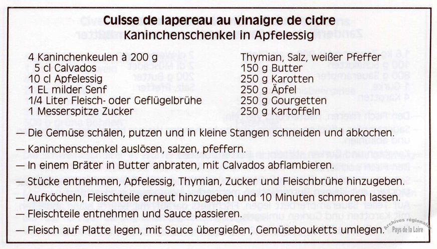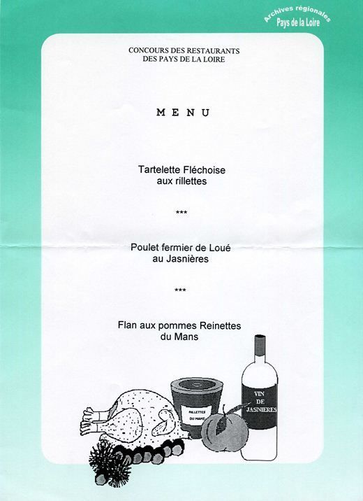 À l’occasion de la semaine du goût 1995, un concours est organisé par la Région dans les restaurants scolaires des lycées. Les règles : élaborer un menu entrée-plat-dessert inspiré par les produits du terroir répertoriés dans le guide du patrimoine culinaire des Pays de la Loire ; pour un coût-matière de 20 francs maximum et pour un minimum de 500 rationnaires. Parmi les candidatures reçues, voici une proposition sarthoise (lycée d’Estournelles de Constant à La Flèche).